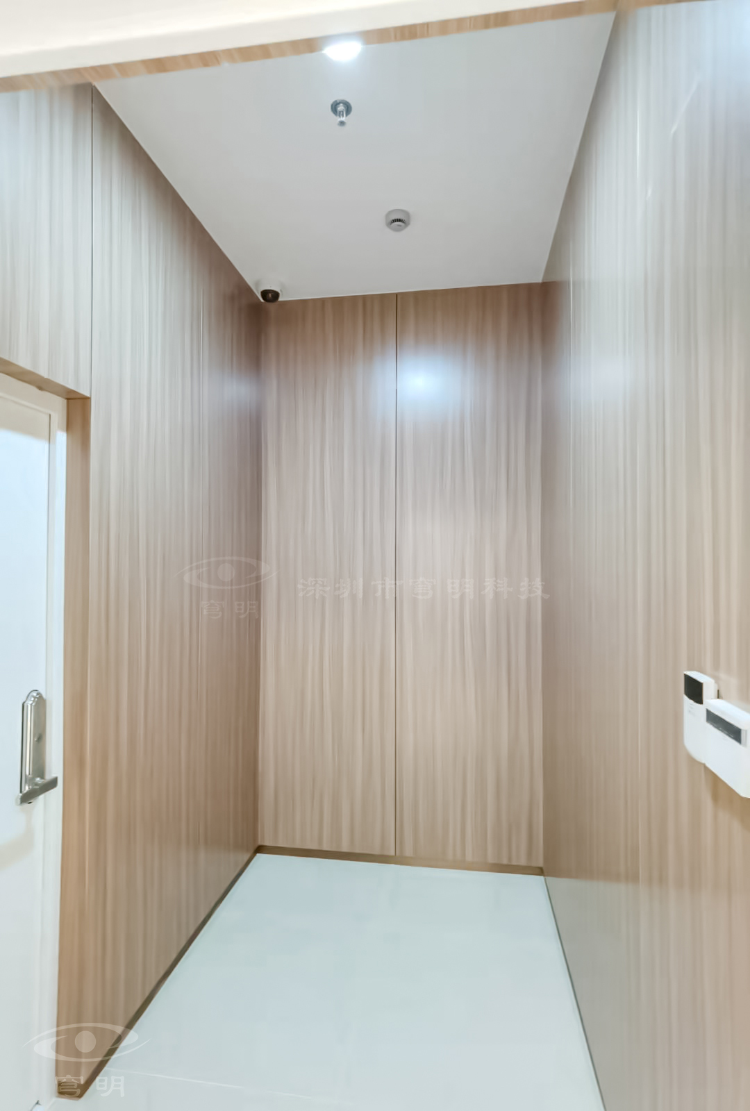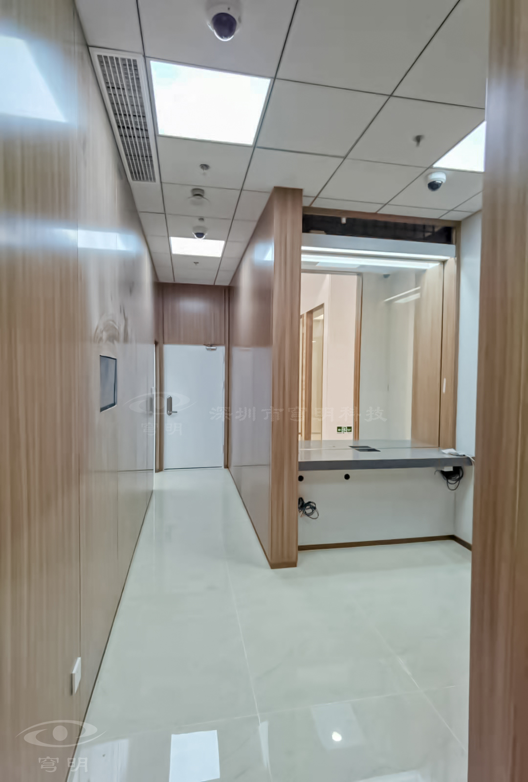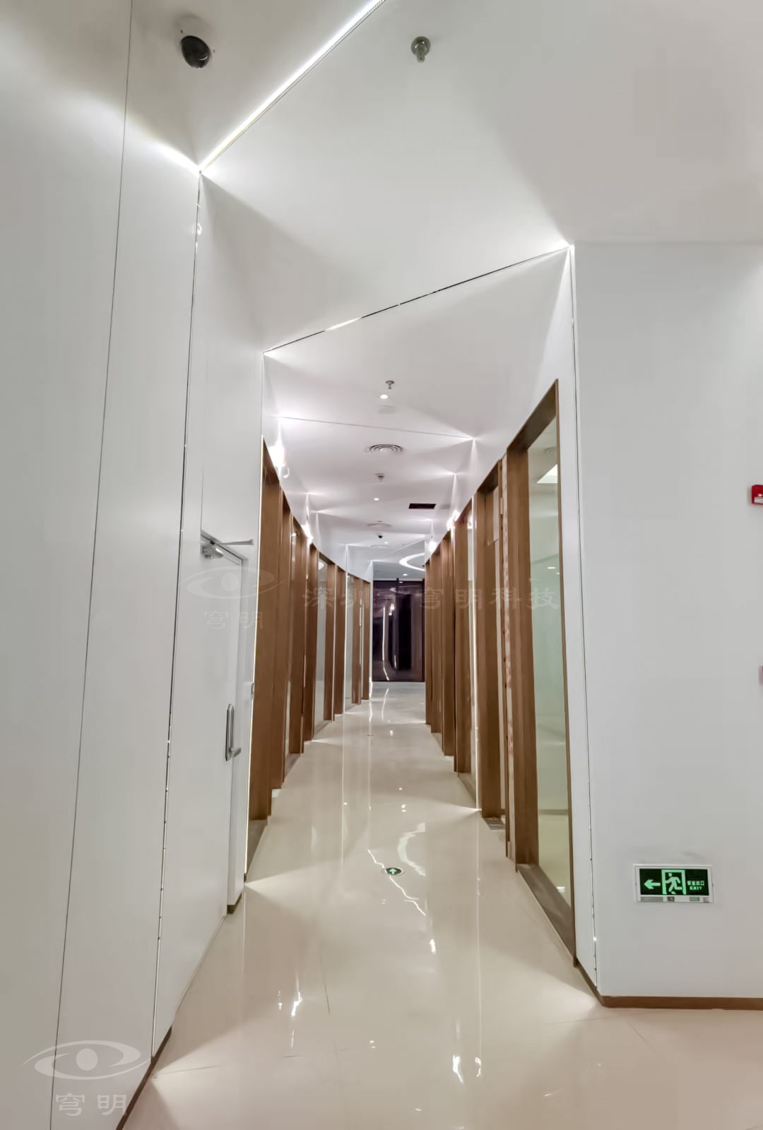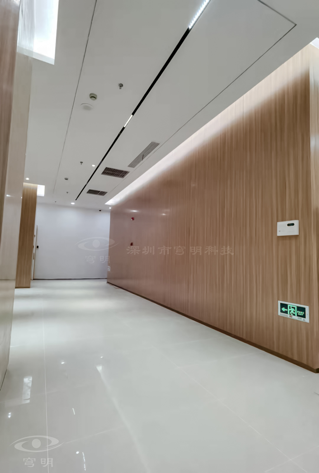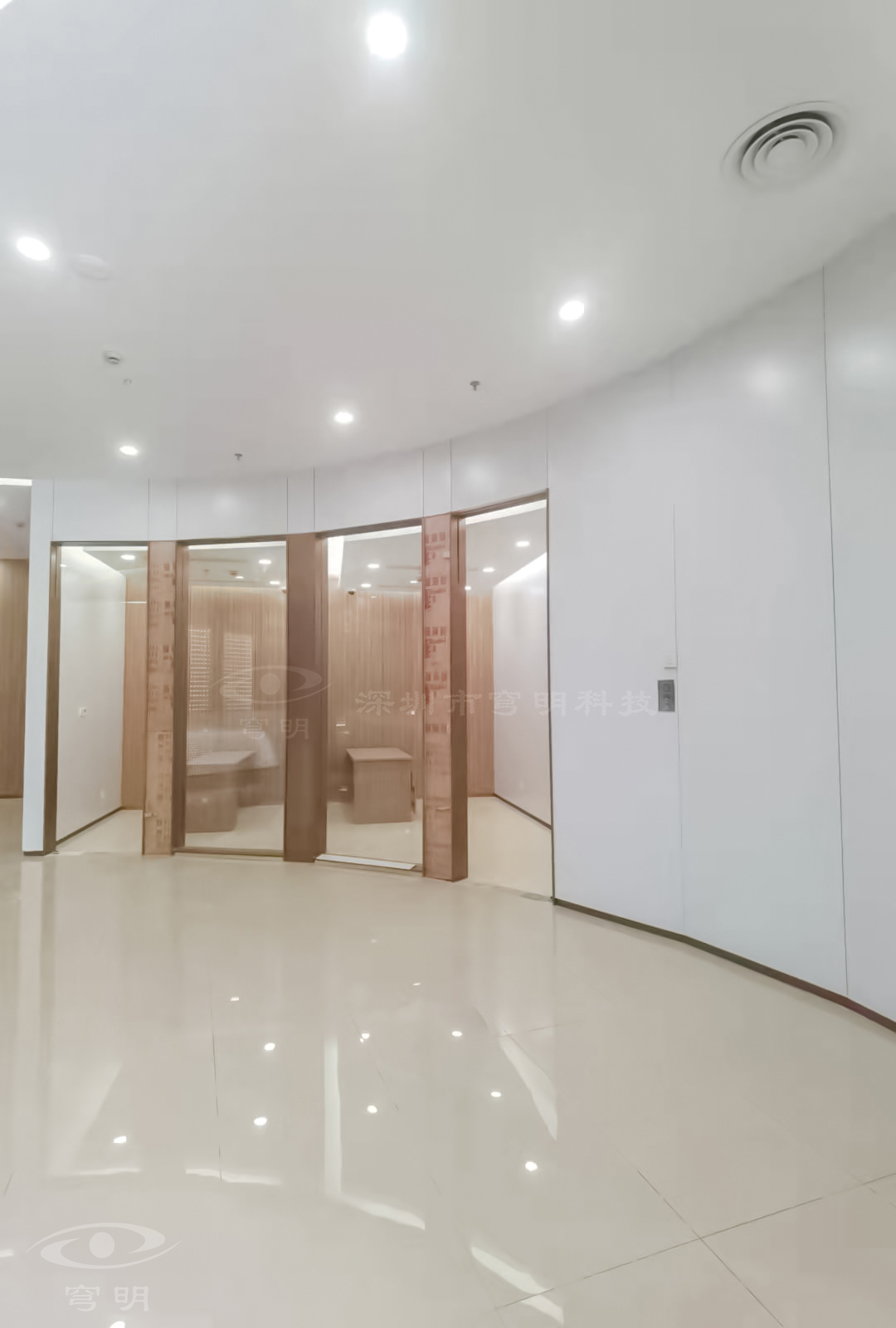 行政走廊以鏡面、陶瓷地板與sy849白色、紅豆杉木紋金屬復合板的碰撞融合,玻璃構成空間的多維度,使觀者置身其中,產生時尚簡約的共鳴。