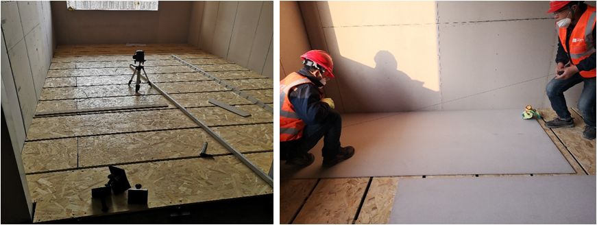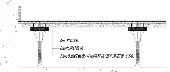 采用ABS高強支撐架空基層板,可采用20mm水泥纖維板、18mm玻鎂板、18mmOBS定向刨花板做基層調(diào)平,錯縫鋪貼8mm水泥纖維板及完成地面架空,面層可根據(jù)設(shè)計要求做各種材料的施工,施工效率高,架空高度可控5cm-25cm;