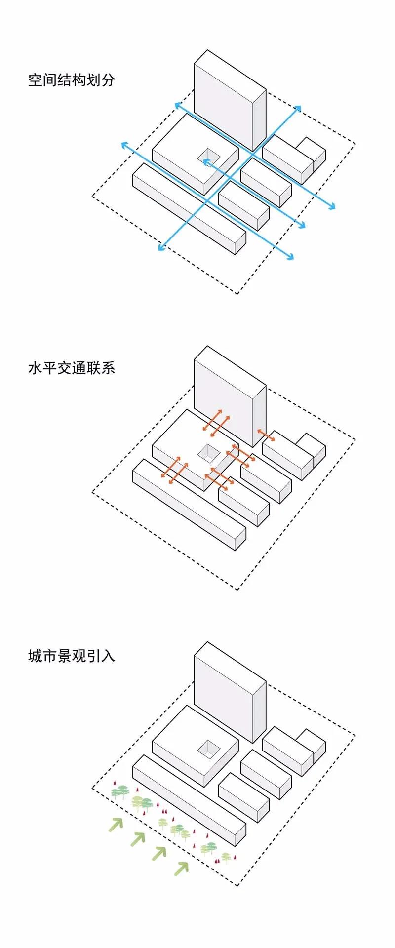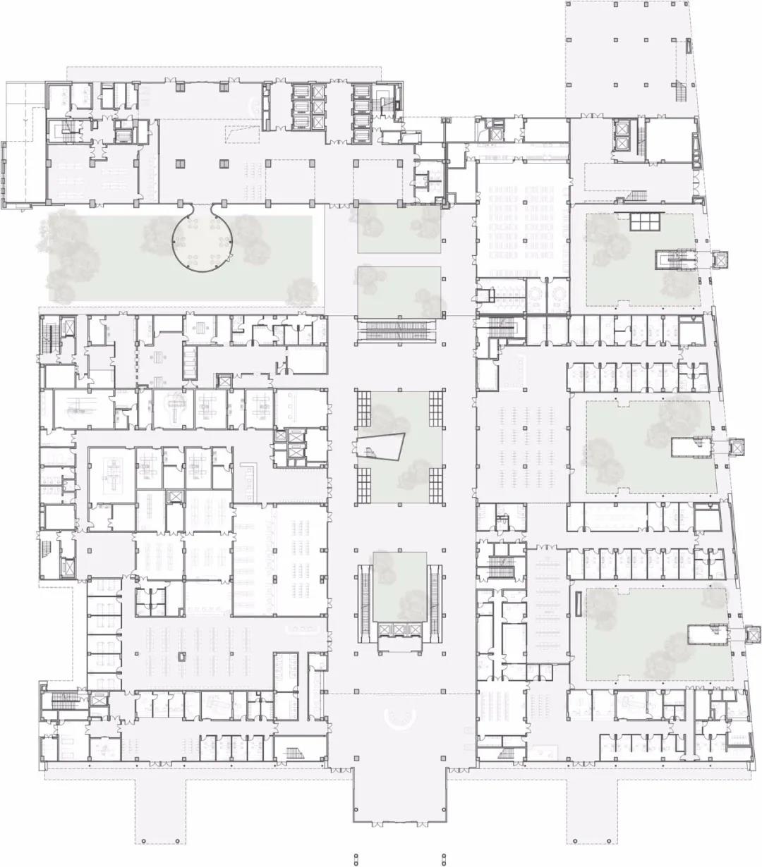 設計將庭院綠化、屋頂綠化、入口廣場綠化等分散的景觀系統引入建筑,同時,分散的庭院綠化與醫院交通軸平行,采用退臺式綠化平臺,最大化每層候診空間的采光和綠化景觀,拉近患者與大自然的距離,提升空間感受的豐富性,形成一個平靜和充滿治愈力的建筑空間。