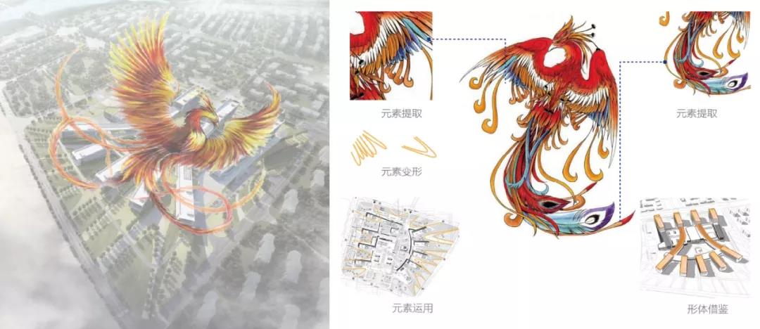 日出東方、火鳳騰飛——方案延續(xù)當(dāng)?shù)貙μ柕某绨菁傍P凰城遺址的歷史文化積淀,取意象征太陽的神鳥鳳凰,將鳳凰羽翼和尾翼的線條進行提煉演變,形成建筑和景觀的構(gòu)成元素,表達(dá)了對歷史和文化的呼應(yīng)。